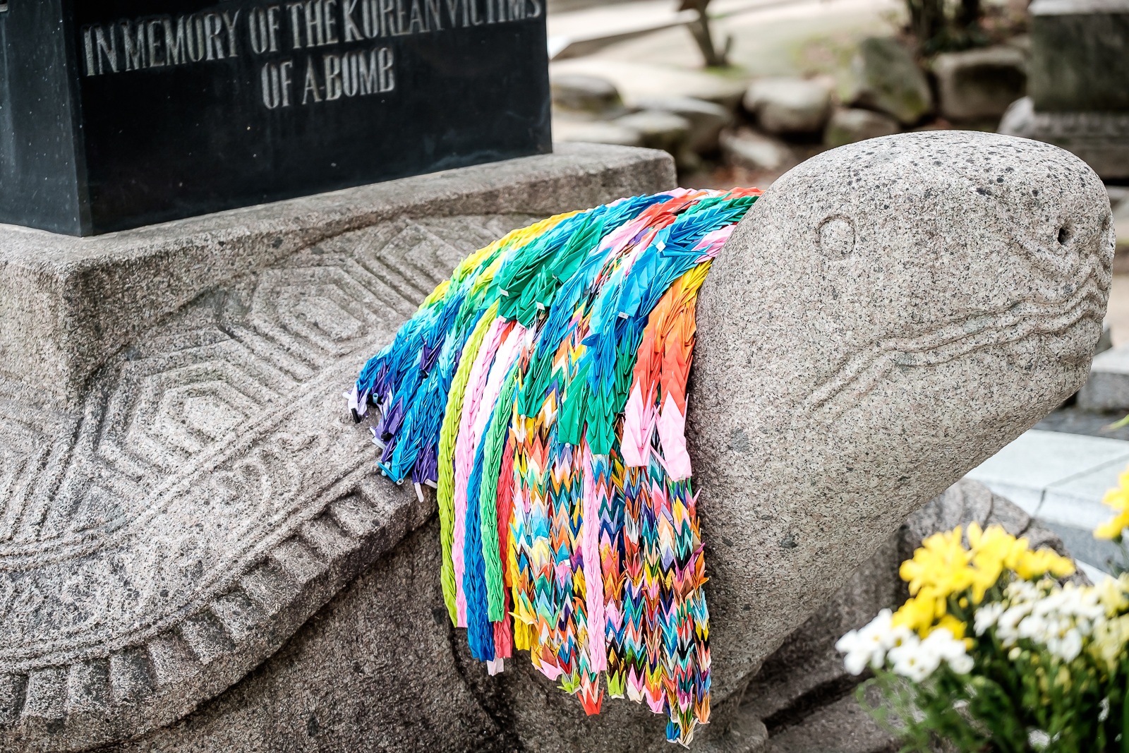 As I wrote in my travel journal back then, quite by chance, I had chosen to visit Hiroshima on the International Day of Peace. There was activity all of the areas including The Peace Memorial Park, The Children’s Peace Monument and the Hiroshima Peace Memorial Museum. Bus-loads of older citizens – most likely survivors or family of survivors of the bomb – were filling the park to attend International Day of Peace events. There were also groups of school children on guided tours being educated about the building and that fateful day. They were also bringing large stings of Origami peace cranes made from brightly coloured paper. These were draped over statues and from specially crafted shelters.