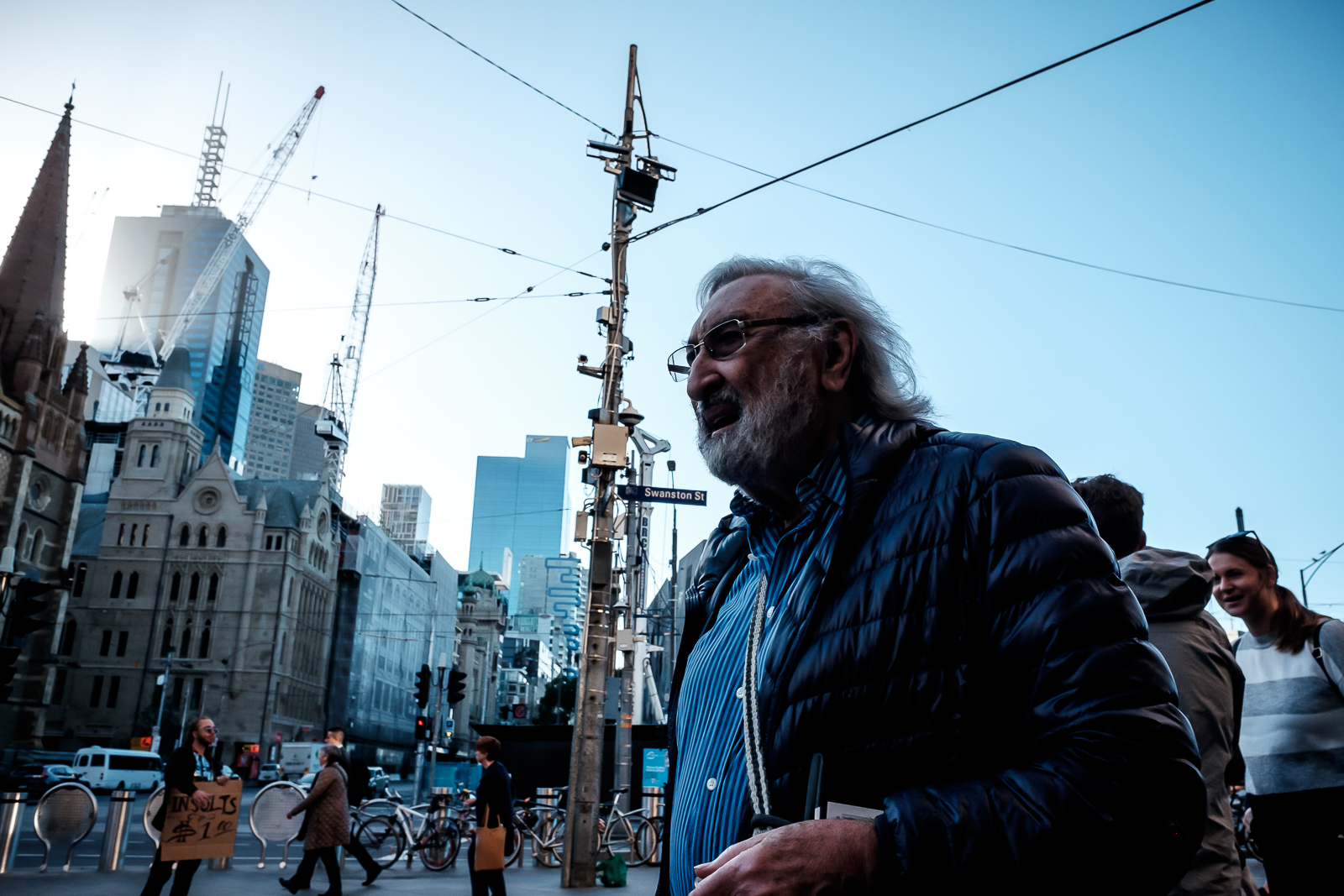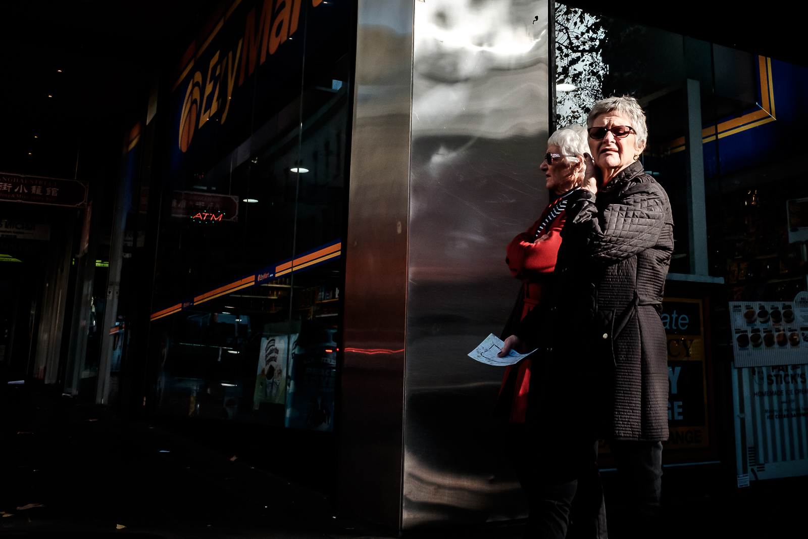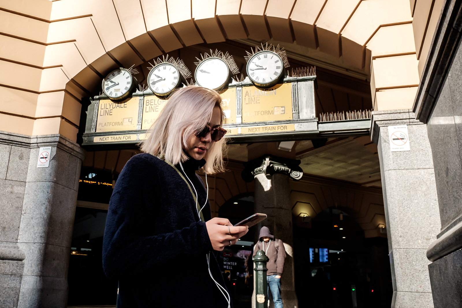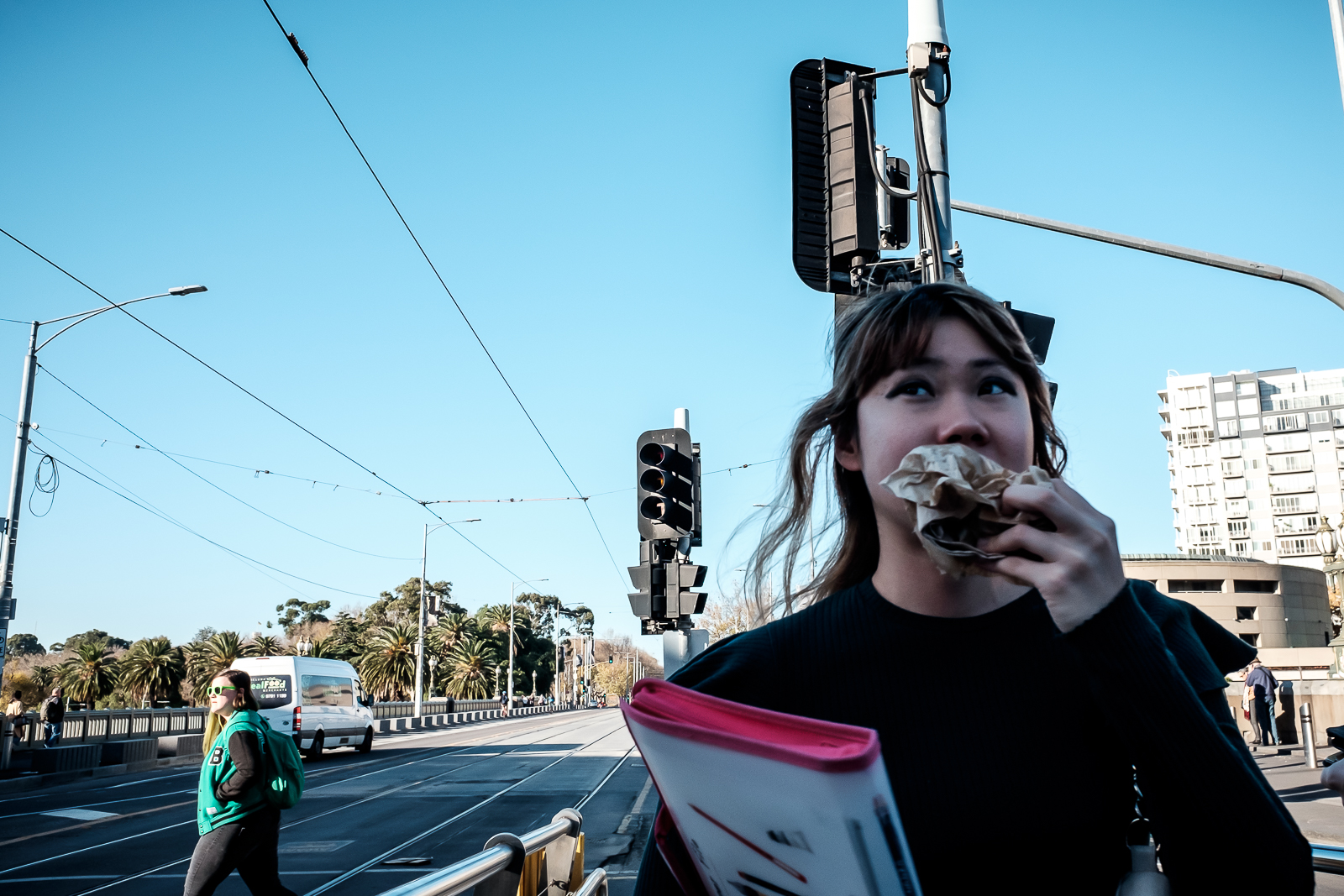 So in a bid to not become house bound and to keep the creative juices flowing I planned in advance that today, I would get out and about for a couple of hours to do some street photography. The day turned out to be perfect. Bright clear winter skys with lots of sunshine. I chose to head out as soon as I had dropped my boy off at school. I took a tram into the city to find that I had missed the peak hour of pedestrian traffic but that there were enough people around to make it work.