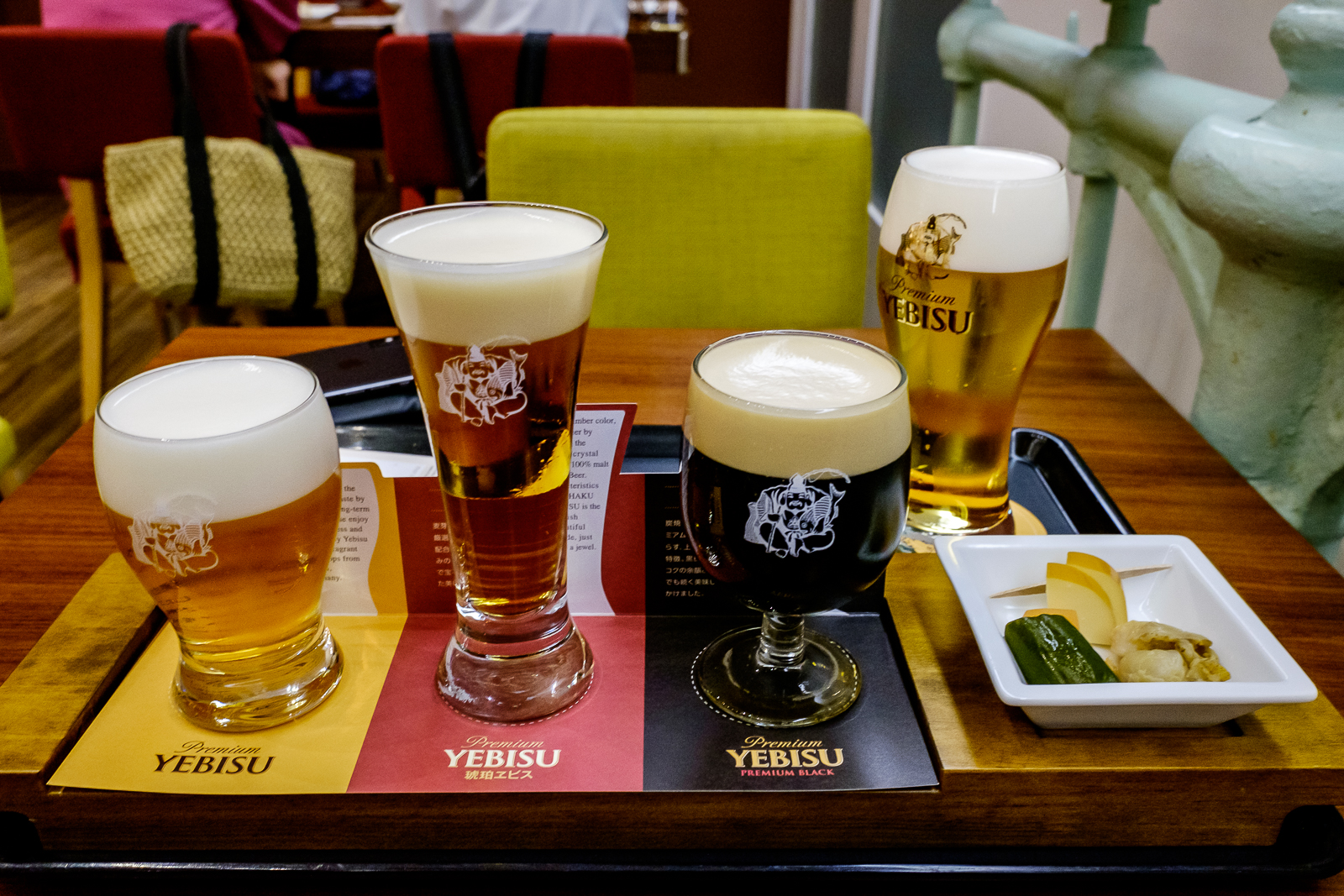 The beer museum was terrific. It is quite a modern complex built in the original brewing grounds from what I could understand. It has an amazingly spacious interior with a deep, broad descending stairs. There are guided tours, but the accommodating lady at information said that they are not in English and I can take a self-tour all the same areas for free. I walked around the area designated form learning the history of the beer and the brewery. There was also a tasting area with a broad range of Yebisu beers available for taste. I decided to test some of the beers and purchased a taster set of three beers. There was a Premium Black, Komaku Premium and Yebisu Beer. The purest of them all. The taster set was accompanied by some pickled veggies.