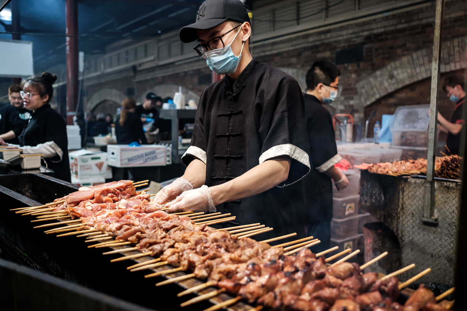 As many of my friends and followers will know, I love Melbourne markets. Both during the day and night. I have written about my times exploring Melbourne’s amazing markets many many times. But the Queen Victoria Night Market is a fantastic event that seems to now be running all year around. I have written twice about the Summer night market here and here. I have written about the Hawker Night Market here. And even written about the Euro Night Market here. I love these events for many reasons. For me, they are a street photographers playground with people getting together for food and company, vendors preparing and selling food. Smoke and steam filling the halls. Then, of course, there is food! Oh, so much food and from so many different cultures. Mouth watering meats from the Mediterranean. Delicious dumplings from Asia. Soul-warming soups and crispy pizzas. So much food.