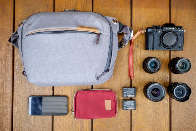 The second layout shown in that same review is similar to what I would pack for a more extensive street outing. The same everyday gear would be packed including my wallet, keys and phone. Then, I would pack the Fujifilm X70 (I never go on a shoot without it) and either the Fujifilm X-T3 or Fujifilm X-E3. With either of those two bodies, I would attach one of the smaller prime Fujifilm lenses and possibly throw in a second for good measure. Even with both cameras in the sling, there is still room for my everyday gear and a spare lens. It is a bit of a squeeze and the bag becomes less comfortable to wear for long periods but it works. Here is a guide to what I might pack for a long period of street work: