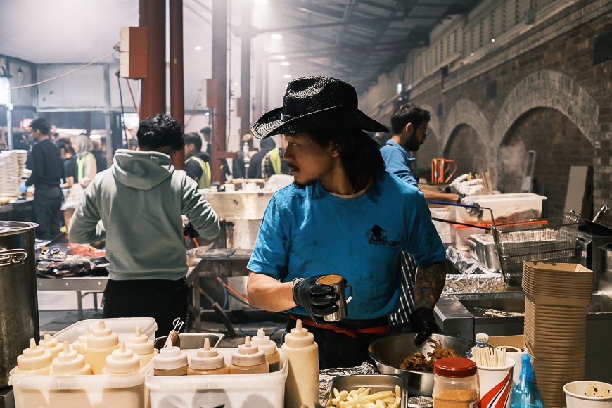 Within 15 minutes of the night market opening, the flux of incoming people had escalated. It was already difficult to keep track of everyone in the group and after a few more imputes I was walking alone and couldn’t see a single member of the group. The food stalls already had long queues of hungry Melbournians lining up. I continued on my path moving with the flow of people as much as possible. I completed a full lap of the exterior of the market before taking my time to walk through the middle. Aside from the food vendors, other stalls were selling books, hats, alcohol, hot drinks, and sweet treats.