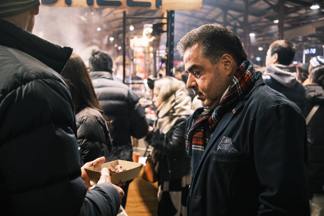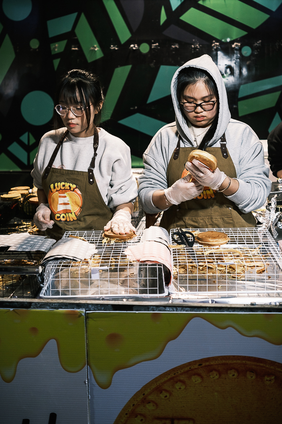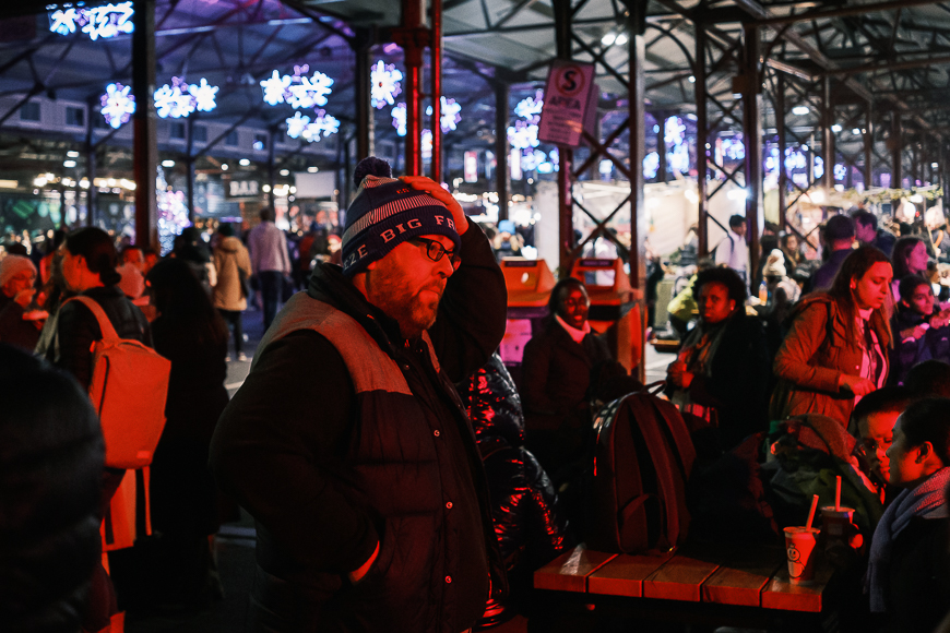 Every now and then, I’d pass or bump into a fellow member of the Fuji group. But before long we’d be swept along with the growing crowd. My good friend Ian was also part of the group and he called me about an hour in to see where I was. We set a meeting point and joined up to continue walking around the market together. Before long we decided that it was time to eat something warm. It was a cold night of around 5° so a warm meal followed by a hot coffee was in order. Ian and I decided to head to a quieter corner of the market to a food van we had spotted earlier. The food van was selling boutique hotdogs, burgers, and soup. We both opted for a hotdog and were lucky enough to find a small table at a cafe. We ordered coffee and sat to enjoy our meal.