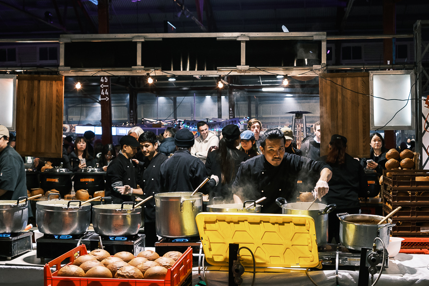 In total, around ten other members of the Fuji X Aus community showed up for the event. As is tradition, we made our greetings and introductions before launching into asking one another what camera and lens we brought to the occasion. As the sun dipped lower, the temperature continued to drop and we all surrounded the fire pit. As the event organizer, I let everyone know that we will make our way through the large market sheds to explore the market. Chances are we were going to get separated as people stopped to take photos while others chased the light in other directions. I suggested that I keep an eye out for a large table so that we could reunite for some amazing food.