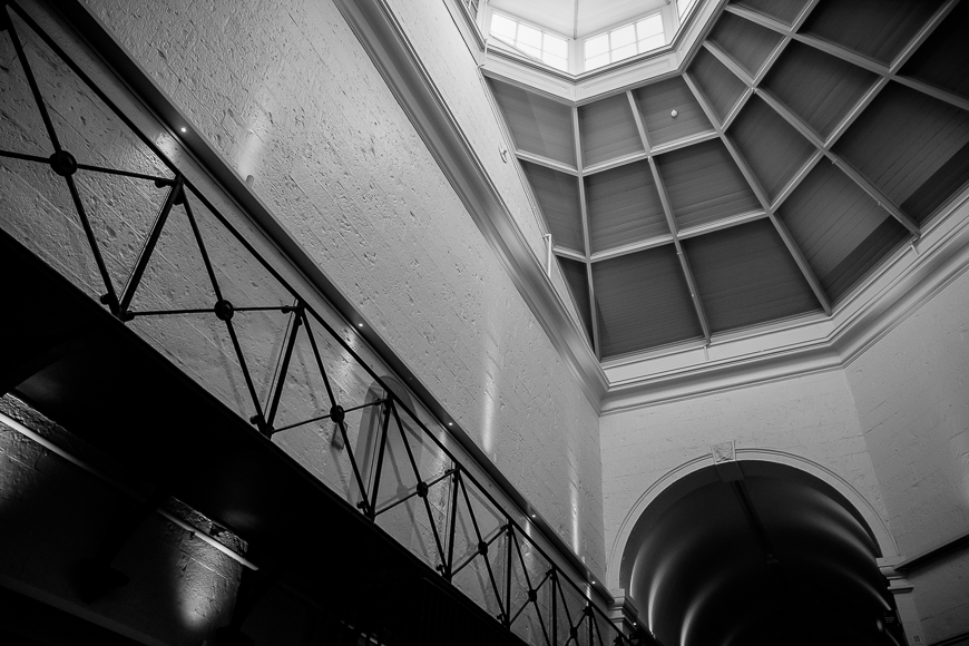 What’s more breathtaking is the quality, consideration, and respect that’s gone into the renovation process. The ground floor is home to a long modern bar and lounge that nestles into the bluestone walls. The bar occupies the central walkway of the ground floor with individual cell doors on either side. To one side, the heavy cell doors remained in place and were carefully covered with a glass pane to protect them. To the other side, the cell doors had been removed, and walkways had been cut between rows of cells to form a lounge area. Keep in mind that a typical B Division cell was only 2 by 3 meters. However, with the joining walls partially removed, the lounge space became open and intimate with soft furnishing and lighting. The remainder of the ground floor featured gallery spaces and original cells for tours. A walkway down to an indoor float pool for hotel guests was at the far end of B Division.