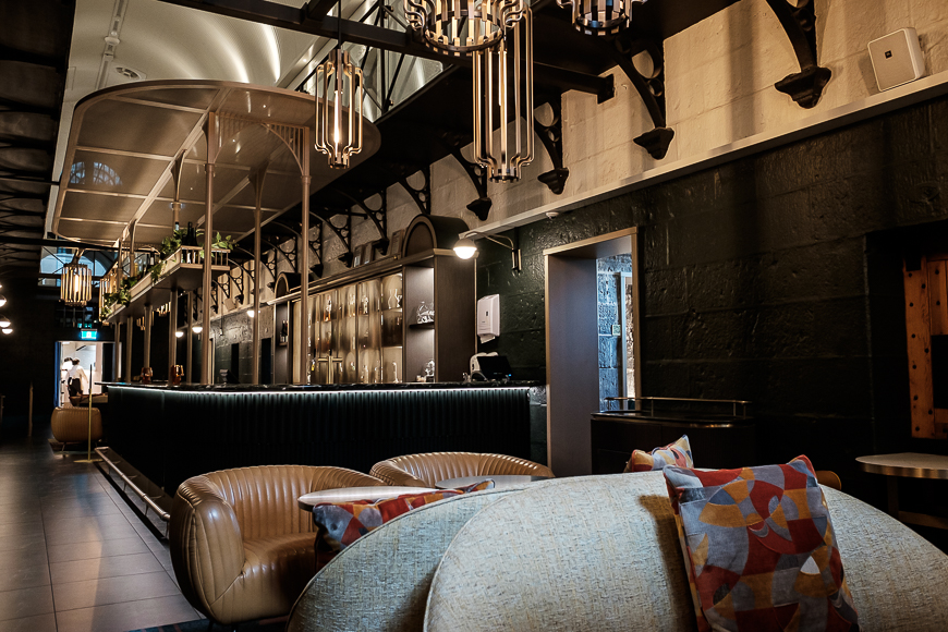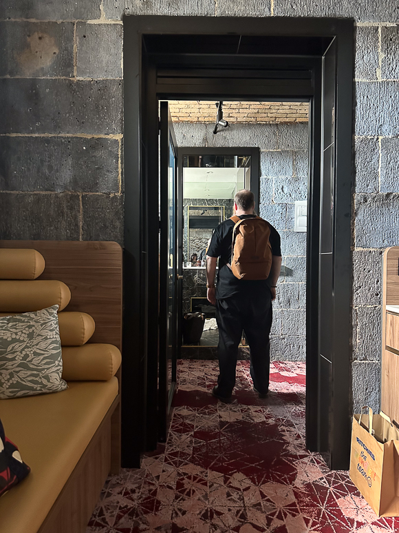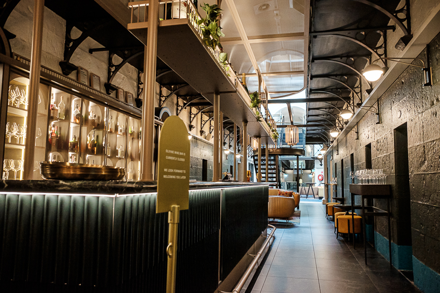 Our short trip from reception to our room was far from quick. We took our time to explore the nooks and crannies and delight at the unexpected elements that made the space so captivating. Our room was on the first floor, accessible by a lift or an iron staircase. The walls of B Division were clean and sparse of adornment, and the wrought iron stair rails were originals. The door to our room was tiny, and we both had to stoop to pass through. Upon entering our cell, we both stood in awe and wonder. Our room comprised four original prison cells, with the walls partially cut away between each. The giant bluestone blocks sat as they had for over 160 years. The entry cell featured a low wardrobe and stand for luggage. To the right, the cell had been converted into a modern bathroom. The lounge space to the left of the entry cell included a long built-in sofa on one side and a bureau on the other. The bureau housed a drawer fridge, kettle, coffee machine, and the usual bottles of wine and stemware. Above the bureau was a large TV. The final cell housed a bed that all but filled the space. It also featured a large TV on the wall for bedtime viewing. The bedroom cell felt like a secret and snug hideaway, given you had to step up onto it.