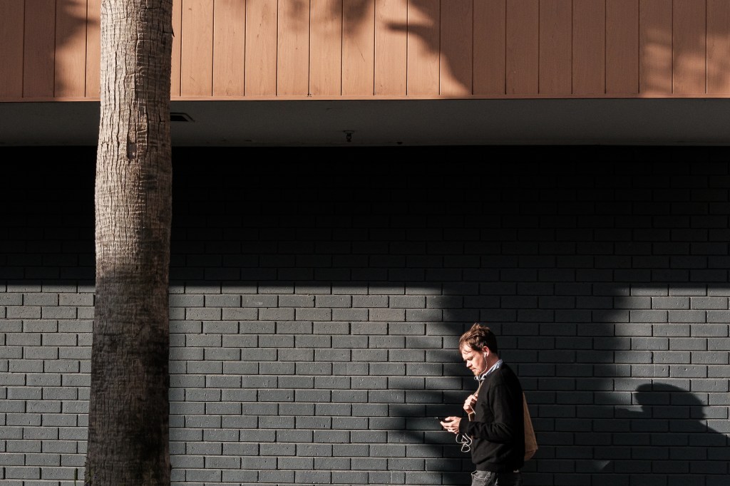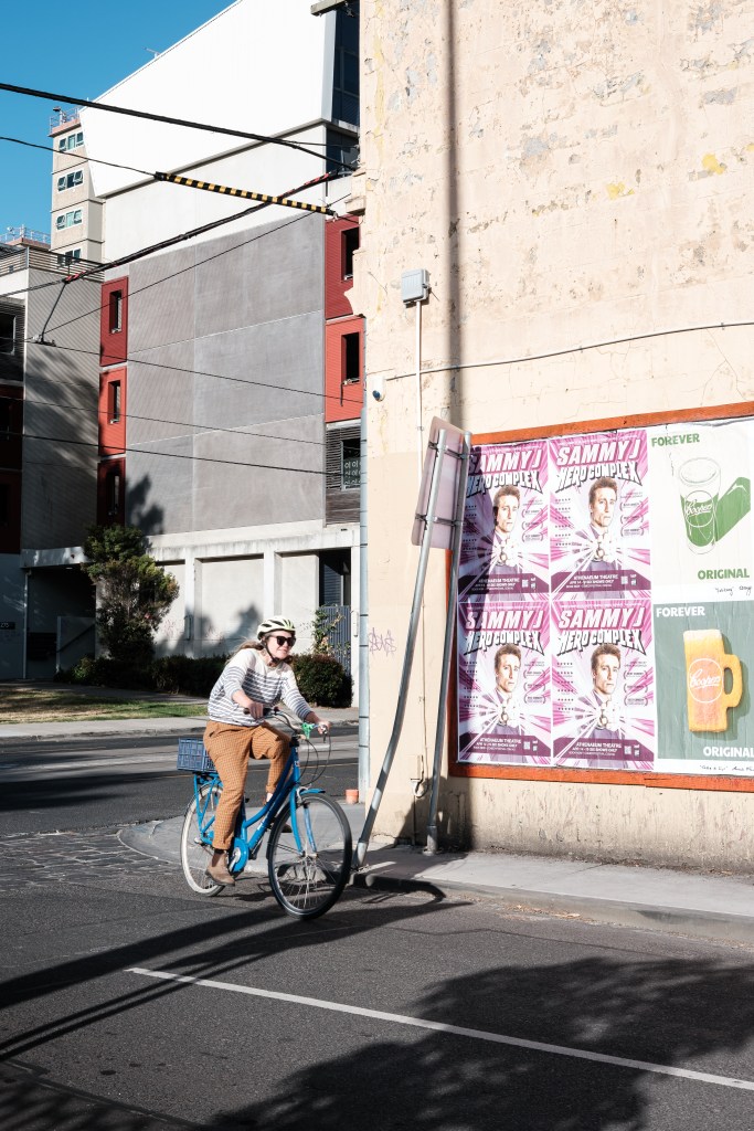 As for my most recent street walk, it was late afternoon on a sunny and warm Thursday. The previous week had been a nightmare of super-hot, windy days, with temperatures reaching 44º Celsius at their peak. But this day, it was mild yet not uncomfortable as I headed out the door. Given the lateness in the day, and thanks to Golden Hour, the sun was low on the horizon and cast long shadows and equally long shafts of golden light. I was walking around South Yarra from the Prahran Skate and Basketball Park and a little further west to Chapel Street. The sleepy days of the Christmas/New Year’s period were over as people returned to work and routine. But it wasn’t so busy that compositions were crowded or complex.