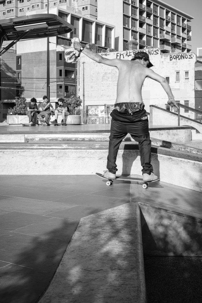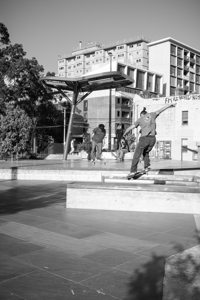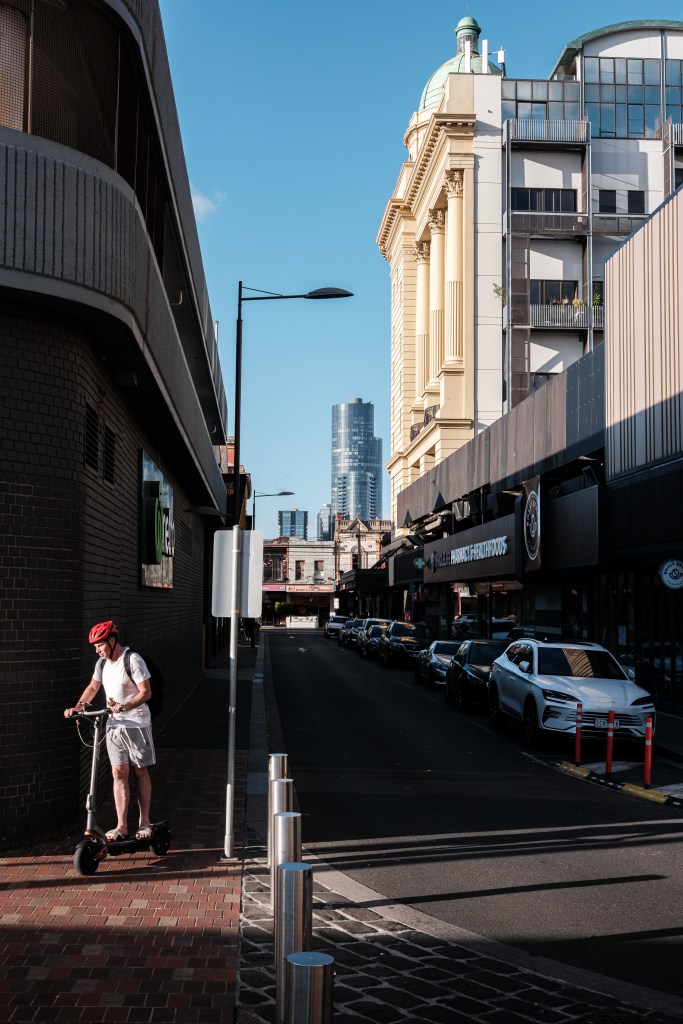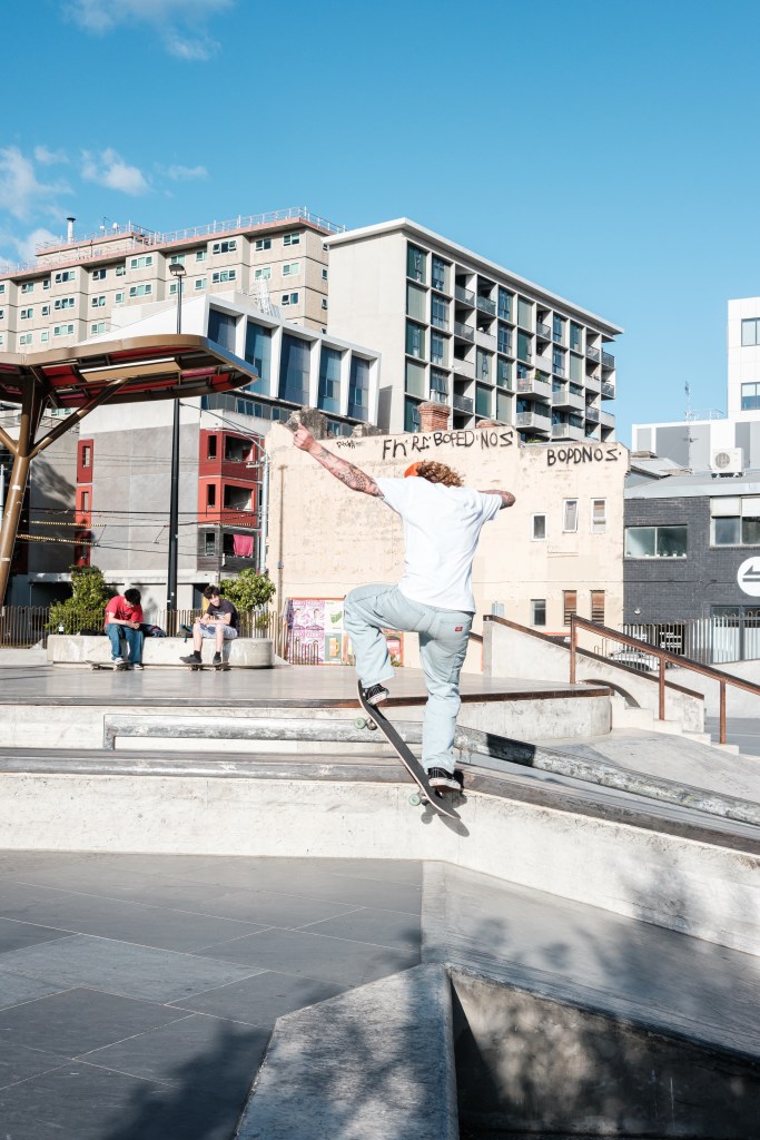 I took my time and strolled along with my Fujifilm X-E5 and Fujinon XF 27mm F2.8 pancake prime. I love this combo for both image quality and the shooting experience. Not only is it compact and lightweight, but it is also a joy to shoot with. The Prahran Skate Park has become a Summer of 2026 favourite for me as I take my time to watch the skaters, determine the best spots to compose, where to stand (safely), and who is an interesting character. From there, Chapel Street was busy, but behind the rows of shops is Prahran Square – used as a thoroughfare for those travelling to and from the Prahran Train Station and Greville Street shops. The light was falling in just the right places, so I took advantage of it and sat or stood, composing frames while waiting for the subject to enter the scene. I spent at least two hours out and about this afternoon, until the sun had all but dropped and the blues of Blue Hour began to creep in.