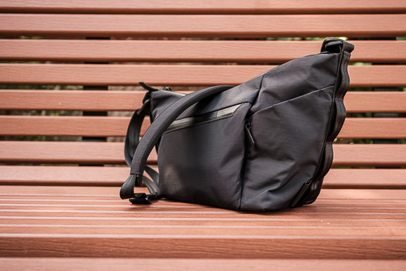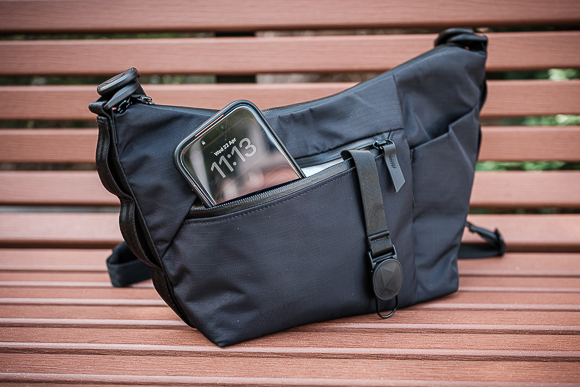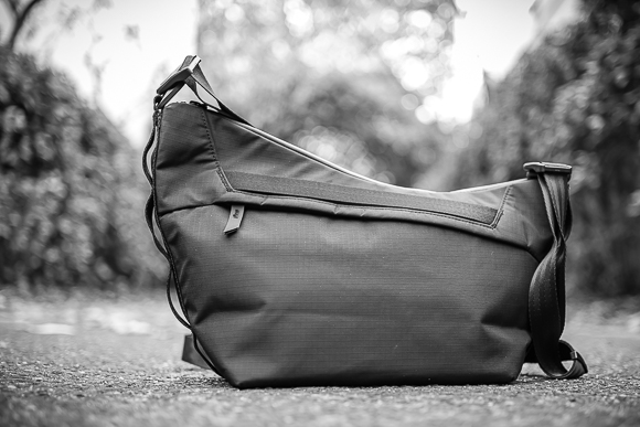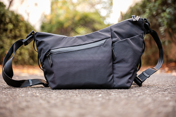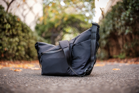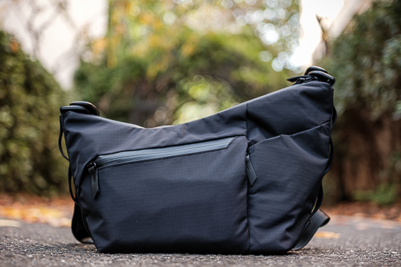 From time to time, I leave my Fujifilm X-E5 and XF 23mm lens at home and take my compact Fujifilm X70, which boasts a fixed 18.5mm F2.8 lens. Released in early 2016, the X70 is a robust and reliable point-and-shoot that’s joined me on street photography trips to Japan. This truly compact street camera weighs just 340g and takes up hardly any space within the main storage zone. As a result, with this kit, there’s still ample room in the bag for additional items, and I can even carry both cameras and my EDC essentials. Regardless of the on-board kit, the Alpaka Flow Satchel (4L) is an incredibly comfortable bag to carry. The soft, padded bag and curved top sit comfortably against my hip without digging in or causing discomfort. Given how the Flow Satchel hugs the curve of my body, I can feel it at all times. That physical feedback, especially when carrying expensive camera gear, is critical when out and about on the streets or while travelling. The shoulder strap offers excellent adjustability and sits comfortably even on a big guy like me. Should I need to access the contents of the bag, I can simply swing the bag around to the front, grab what I need or put away what I don’t, and quickly swing it back behind me. And that wide main zipper allows me to open the bag right up for easy access. Every pocket is easy to access and large enough to fit my hand. What I love most about this Alpaka bag is its ability to retain its shape when sitting on a table, and whether it’s loaded with a large or small EDC kit, it maintains its slick, slimline appeal.